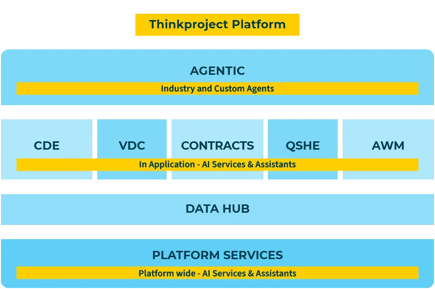 Thinkproject AI is the umbrella name for AI enhancements added to the Thinkproject Platform, covering platform-wide AI services, AI assistants inside applications, and an industry-first Agentic layer. It is not a new platform; it augments the Built Asset Lifecycle Platform you already know.