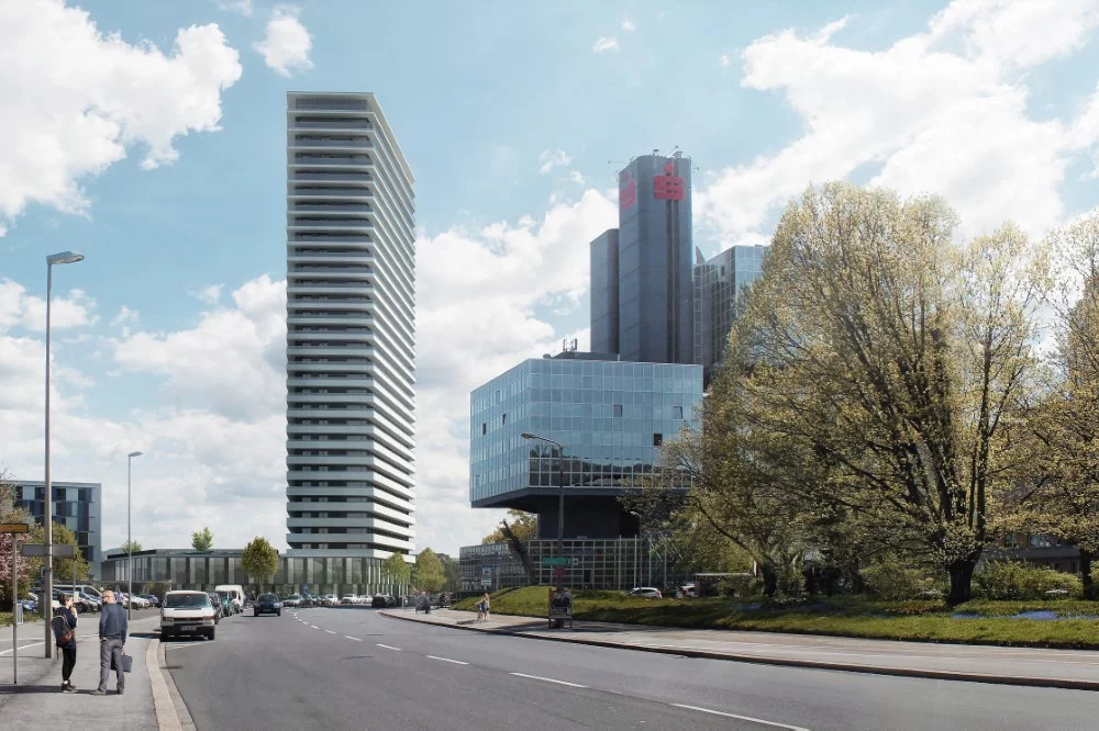 Allein 357 Wohnungen befinden sich im mit 98 Metern größten Hochhaus der Stadt. Zusätzlich kann das markante Gebäude zukünftig zwei Schulen beherbergen und verfügt über eine Parkgarage. Eine der Schulen und der Kindergarten befinden sich bereits im transparenten Sockel des Turms. Neben dem Innenhof und den zwei Vorhöfen ist eine großzügige grüne Dachterrasse geplant.