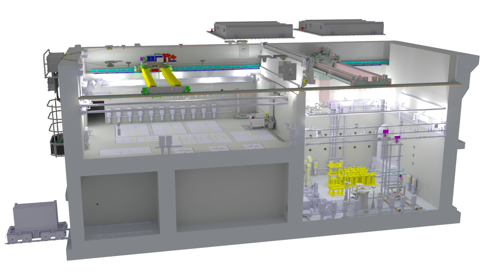 Zu diesem Zweck arbeitet das Unternehmen mit mehreren Suunternehmern zusammen, die alle parallel planen, um die Projektfristen einzuhalten. Die gelieferte Ausrüstung umfasst zwei strahlungsresistente Portalkräne: einen mit einem ferngesteuerten Greifer und einen, der über einen 14 m langen Teleskopmast ein Paar Robotermanipulatoren einsetzt.