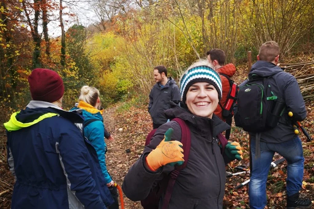 Wir engagieren uns leidenschaftlich gerne in unseren lokalen Gemeinschaften und nehmen Wissen und neue Fähigkeiten mit nach Hause. Unser britisches Team hat kürzlich beim Gloucestershire Wildlife Trust alles über die Pflege von Waldgebieten gelernt.