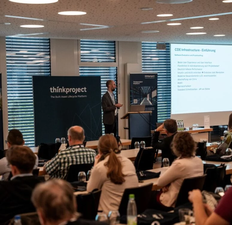 Beste User Experience, Flexibilität und Individualisierung nach Projektbedarf: Sven Söhlmann, Director Services bei Thinkproject, freute sich, Ihnen Funktionsneuheiten und die Roadmap unserer CDE Infrastructure vorzustellen und Ihnen einen Einblick in die Sicherheitsstandards zu geben.