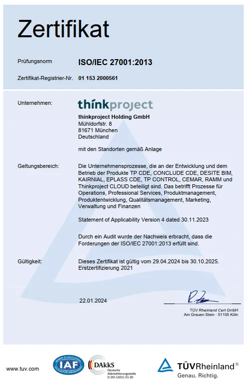 Thinkproject ist mit all seinen Mitarbeitern und Prozessen ISO / IEC 27001 zertifiziert.
