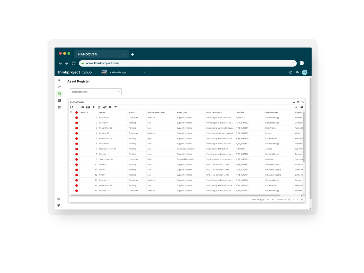 Sie verwalten sämtliche Assets in einem einzigen Register. Leistungsstarke Such- und Filteroptionen erleichtern das Auffinden. Bestands- und Inbetriebnahmedaten erfassen Sie während der Bauphase in diesem Register, validieren sie anhand vordefinierter Regeln in den Asset-Vorlagen und korrigieren sie bei Bedarf.