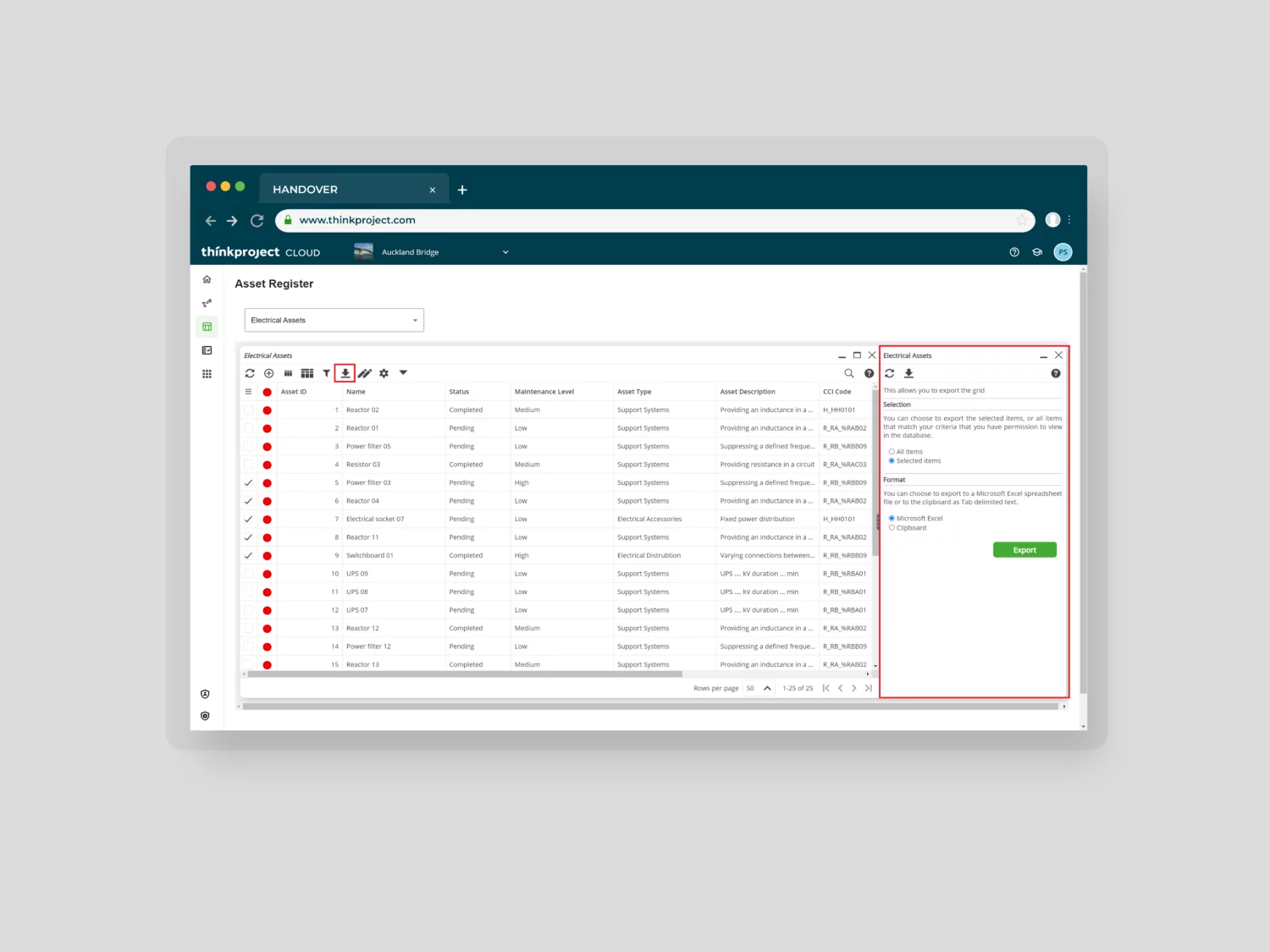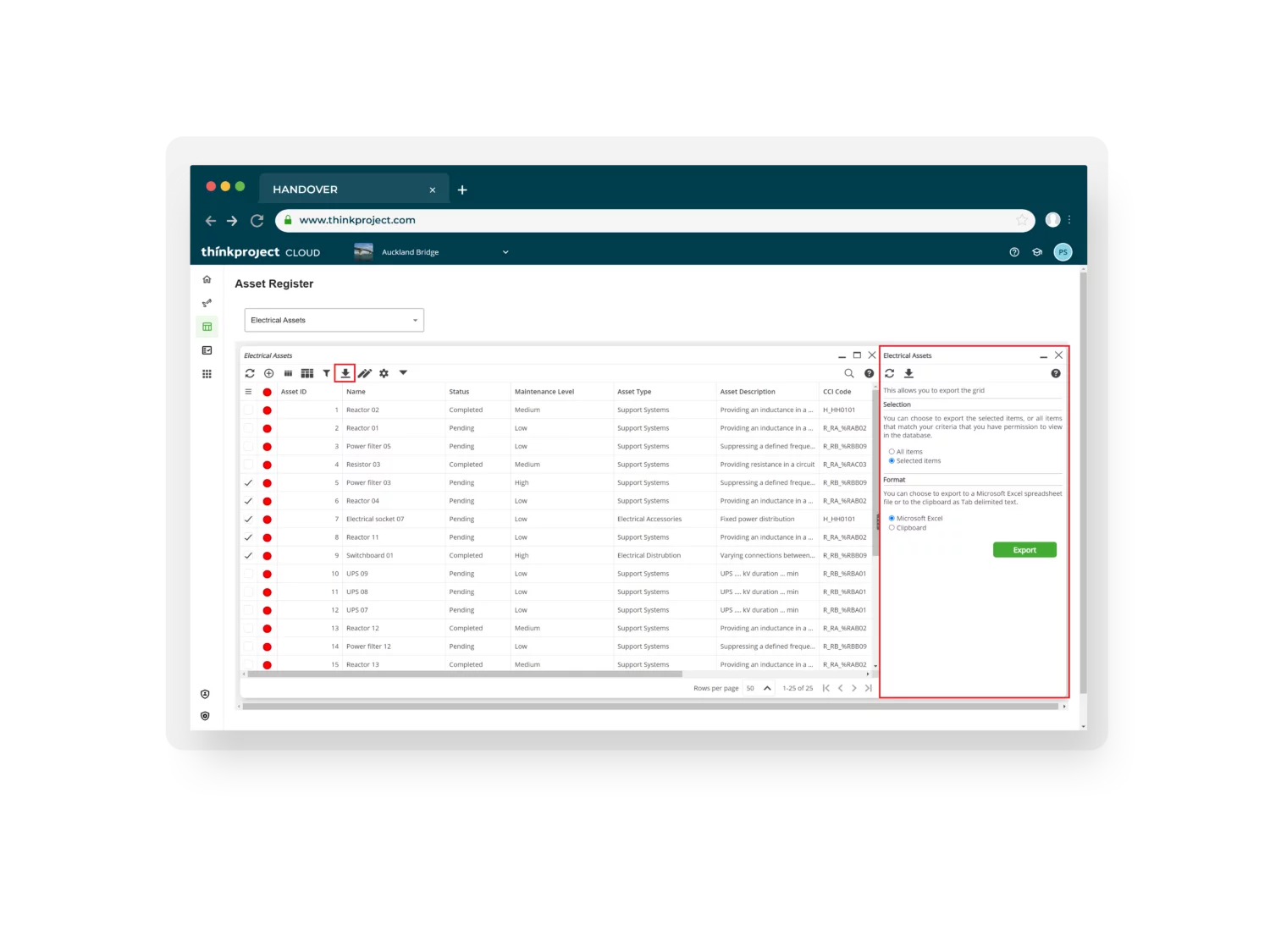 Die Daten können in branchenüblichen Formaten und Strukturen übergeben werden. Sie sind danach sofort im Thinkproject Asset Management oder einem beliebigen anderen Asset-Management-Tool eines Drittanbieters verfügbar.