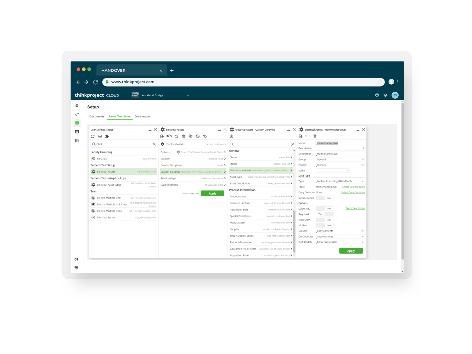 Définissez des modèles d’actifs personnalisables adaptés à vos besoins en fonction du corps de métier, des niveaux de maintenance ou de tout autre paramètre, en spécifiant les attributs requis. Configurez des règles pour associer automatiquement la documentation relative à la livraison des données provenant d’un CDE aux dossiers d’actif pertinents dans le système Handover Management.