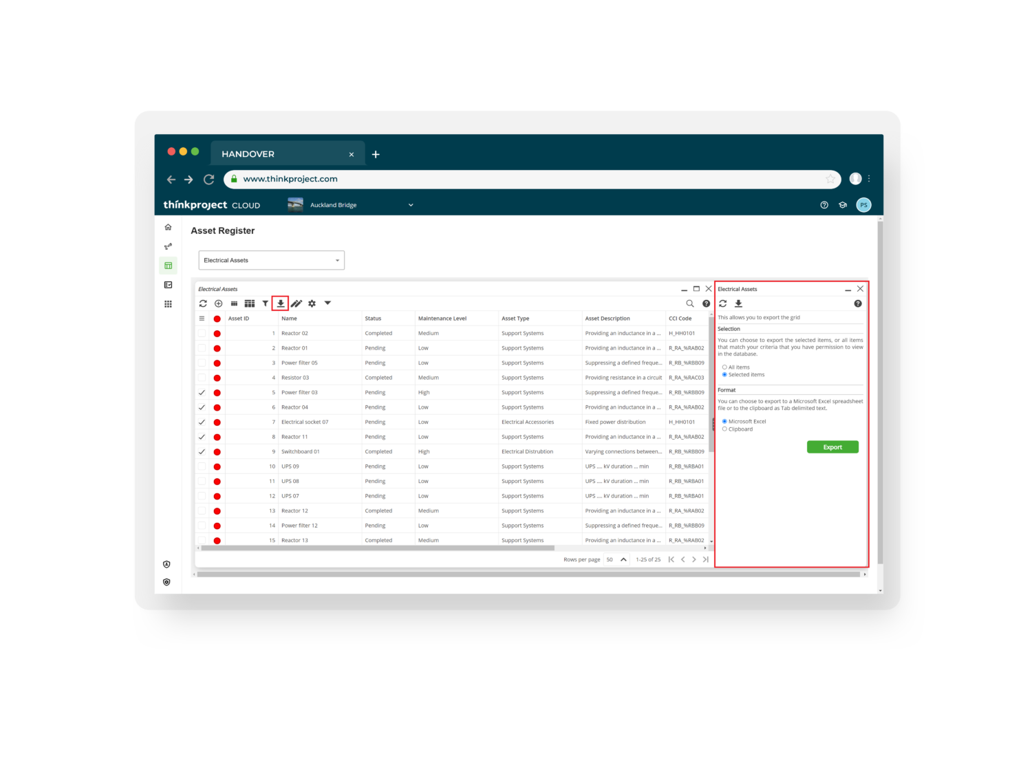 Exportez des données de qualité dans les formats et la structure de votre choix pour les actifs prêts à être transférés. Les données sont facilement disponibles dans Thinkproject Asset Management lorsqu’elles sont implémentées dans l’outil Asset Management de Thinkproject ou dans tout autre outil de gestion d’actifs tiers via un transfert numérique.