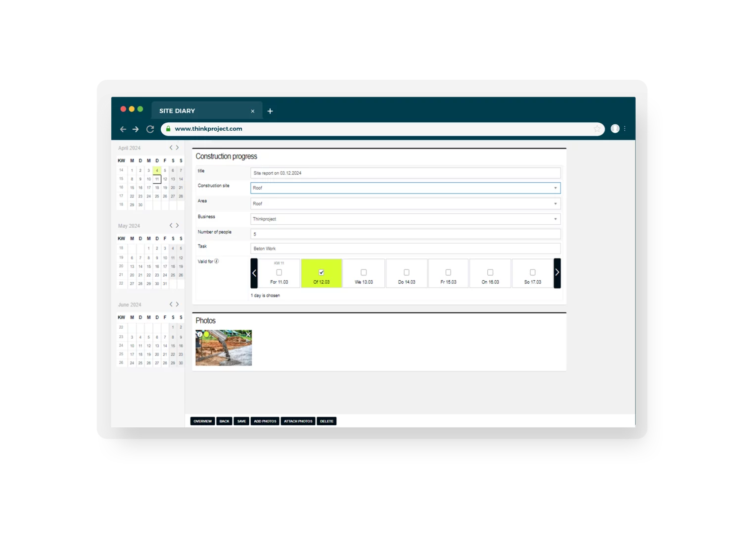 Les formulaires permettent de saisir des données clés, de générer des rapports PDF détaillés et d’importer automatiquement les informations météorologiques dans le journal de chantier.