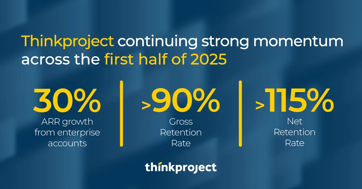 Thinkproject achieved 30% ARR growth from enterprise accounts and welcomed over 200 new customers, reinforcing its market leadership and the strategic value of its asset-centric platform. The company reported a Gross Revenue Retention rate above 90%, reflecting strong customer loyalty, and a Net Revenue Retention rate in excess of 115%, indicating significant account expansion and increasing platform adoption.